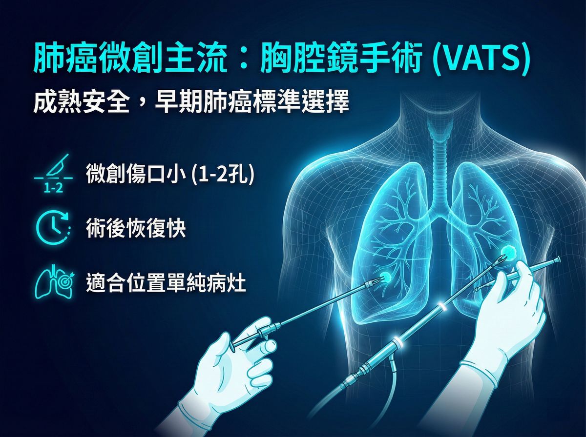 胸腔鏡手術最大特色在於「微創」本質。醫師只需要在胸腔開一到兩個小傷口,就能夠將器械伸入體內手術。根據臨床經驗,胸腔鏡手術具備「傷口小」與「恢復快」顯著優點。大多數被診斷為「早期肺癌」的病人,或是腫瘤位置相對單純、好處理的病人,胸腔鏡手術已經非常足夠。胸腔鏡手術能順利完成標準的肺葉切除或肺節切除,在創傷最小化的前提下達到治療目的。