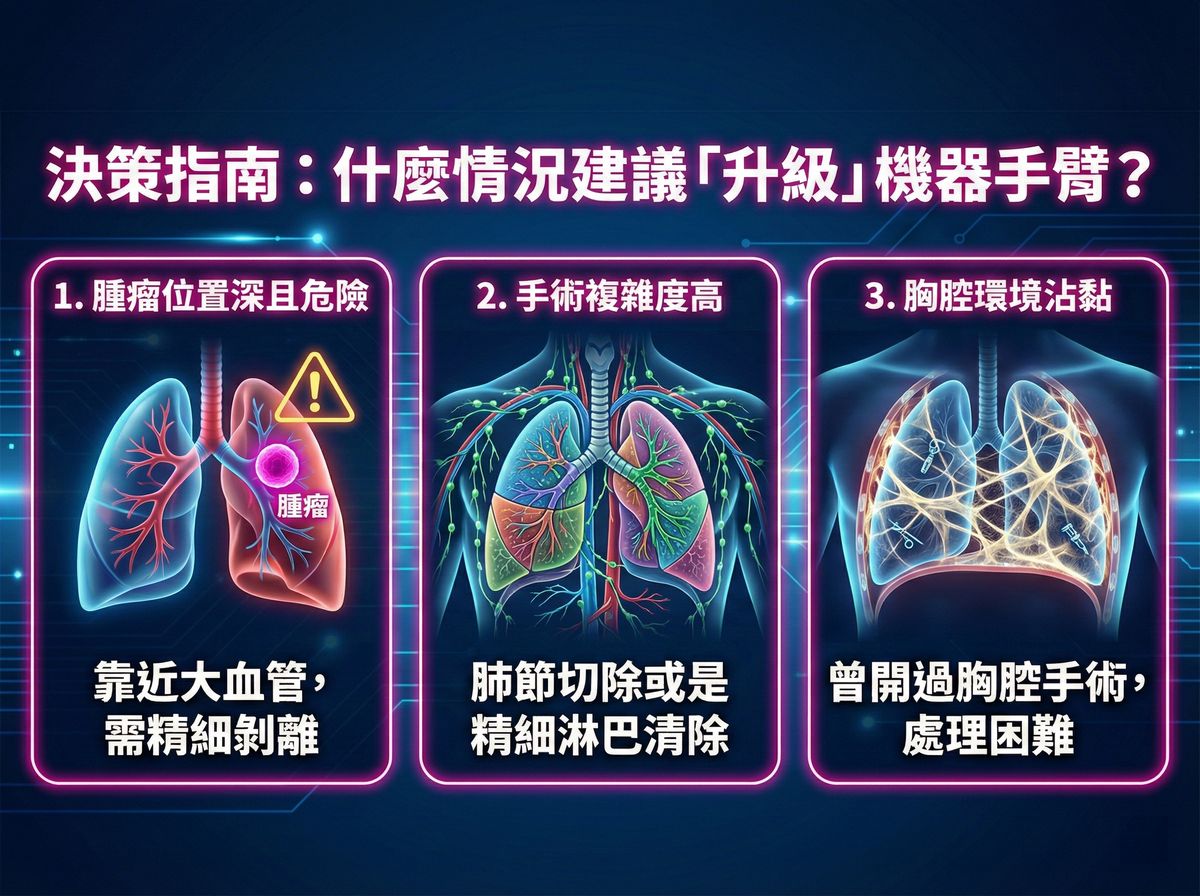 當腫瘤生長在肺部深處,或位置非常靠近大血管時,手術風險相對較高。機器手臂的穩定度與精細視野能幫助醫師更安全地剝離組織,避免傷及血管。 - 手術複雜度高