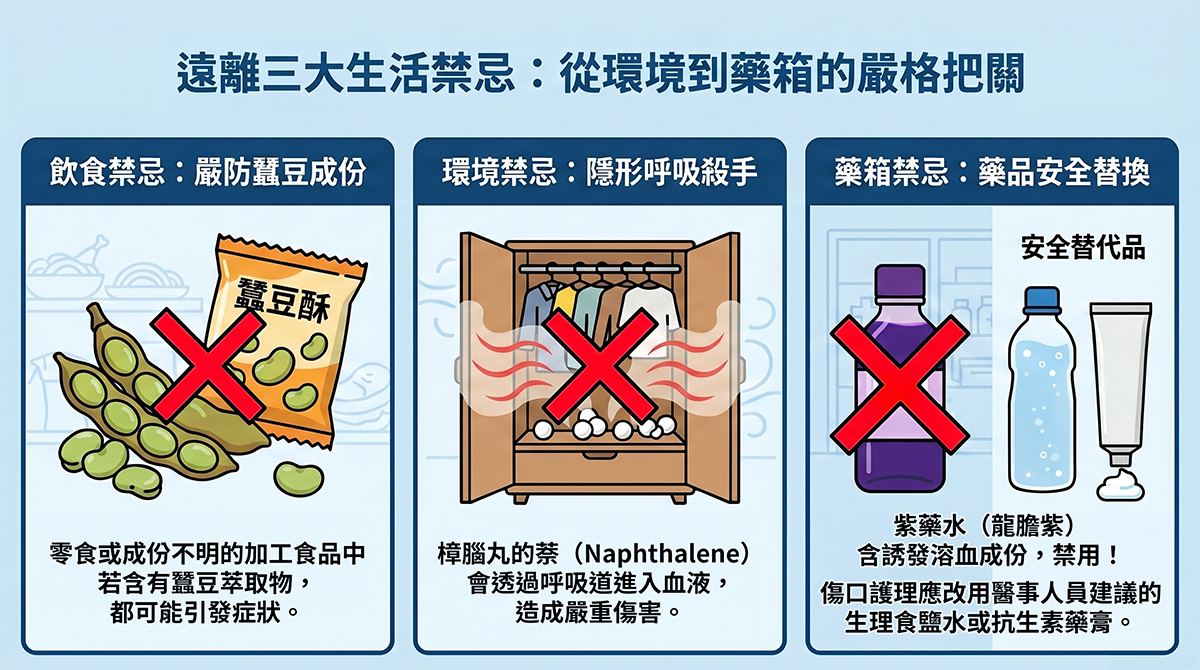 許多複方感冒藥或保健藥品可能隱藏影響代謝的成分,任何藥物的使用皆應經過醫師或藥師的專業處方與確認。透過家庭成員共同落實這些防護準則,便能讓蠶豆症孩子在安全的環境下成長,避免非必要的健康風險。