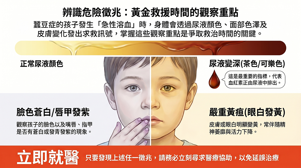 即便家長再細心,生活環境中仍可能存在未知風險。因此,學會「觀察症狀」是家人的必修課。如果孩子誤觸禁忌物引發「急性溶血」,身體會發出以下警訊: