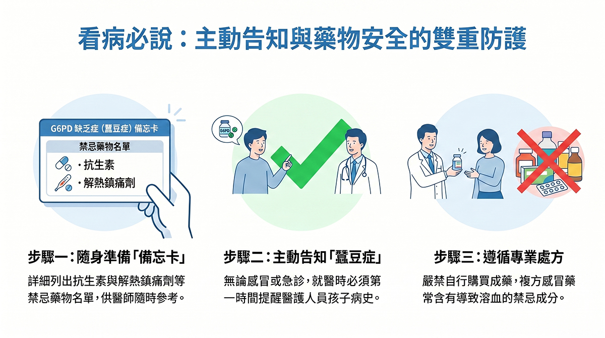 在任何診療場合,無論是感冒就醫還是急診,請務必「主動告知」醫護人員孩子患有蠶豆症。同時,千萬不可自行去藥局購買成藥給孩子服用,因為許多複方感冒藥可能含有禁忌成份。