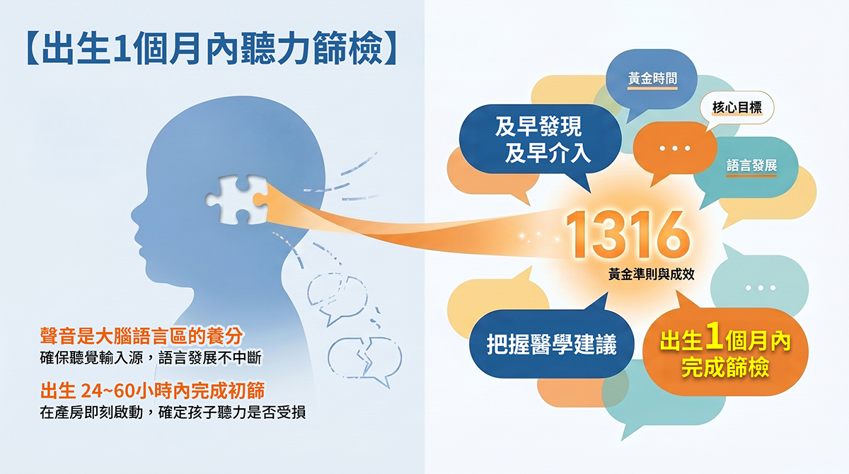為什麼這麼急?因為「聽覺」是大腦發育的重要輸入源。若能早一步發現異常,我們就能在孩子大腦語言區發育的最精華時期採取行動。醫學數據顯示,及早發現並處理的聽損兒童,其認知發展與一般孩子無異。因此,「1316」中的第一個「1」,就是要求在出生1個月內完成篩檢,為孩子爭取最完美的起跑時機。