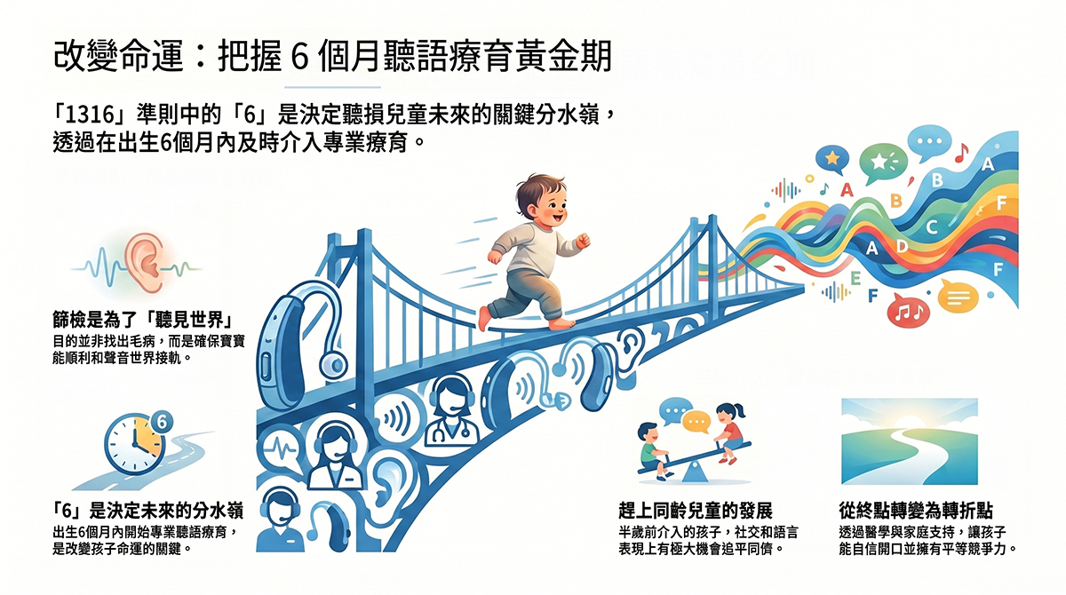 「1316」準則的最後一個數字「6」,是決定孩子未來的分水嶺:在出生6個月內開始接受專業的聽語療育。這不只是醫學上的建議,更是改變孩子命運的承諾。
