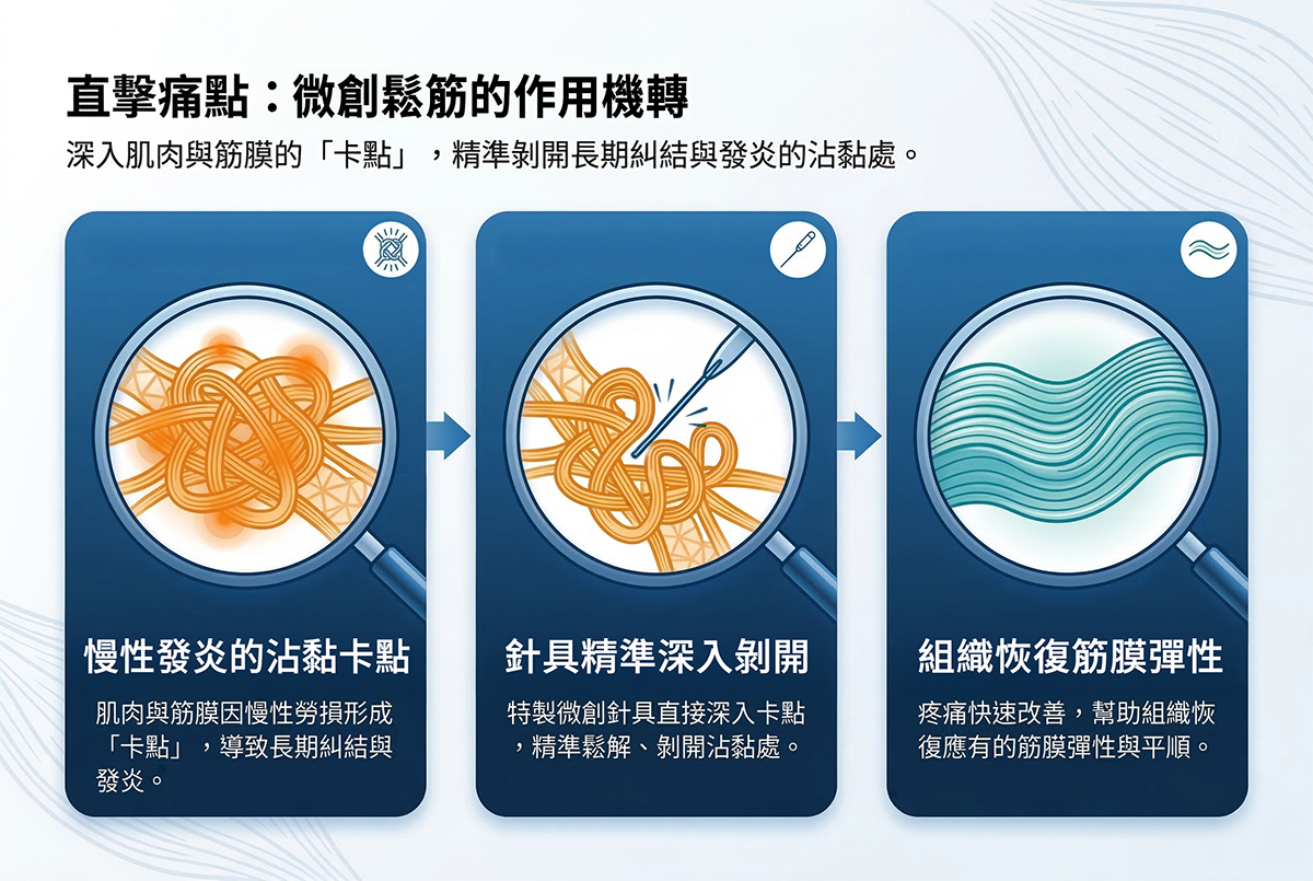 許多病人深受慢性疼痛所苦,又不敢接受手術。小針刀的微創特性就能完美契合需求。小針刀的運作是讓特製針具直接深入肌肉與筋膜的「卡點」,並且去「鬆解沾黏處」,剝開鬆解長期糾結、發炎的沾黏後,病人的疼痛就能快速改善,同時也幫助組織恢復應有的筋膜彈性。