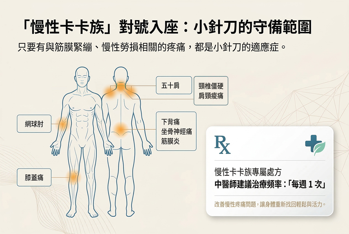 小針刀專門用來放鬆人體卡住的筋膜與沾黏,是現代社會廣大「慢性卡卡族」非常對症的治療選擇。只要有與筋膜緊繃、慢性勞損相關的疼痛,都能使用小針刀。