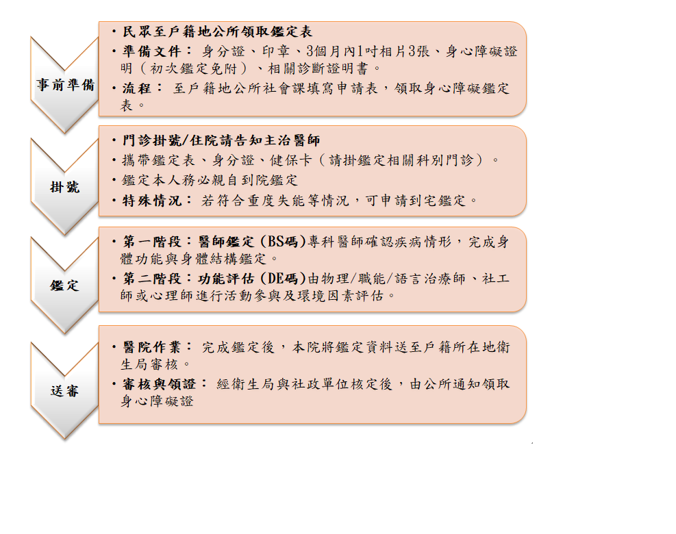 在本院進行身心障礙鑑定(第一及第二階段),第一階段由醫師鑑定,申請人本人需親自到院並請掛原主治醫師;第二階段由鑑定人員鑑定(社工師、心理師及復健治療師等),鑑定時間由本院人員安排,敬請大德依本院為您安排之時間親自至指定地點完成鑑定。鑑定結果將由本院人員直接寄送至您戶籍所在地衛生局。