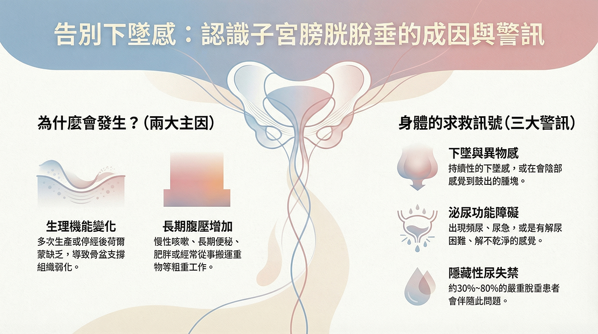 經歷多次生產,或停經後因荷爾蒙缺乏導致骨盆底組織鬆弛。 - 腹壓增加