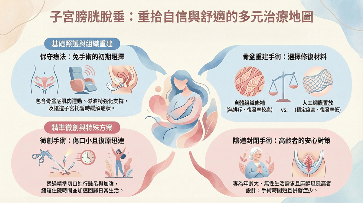 子宮膀胱脫垂並非不可逆,請尋求專業醫師的評估、討論並選擇最適合您的治療方式,改善生活品質。
