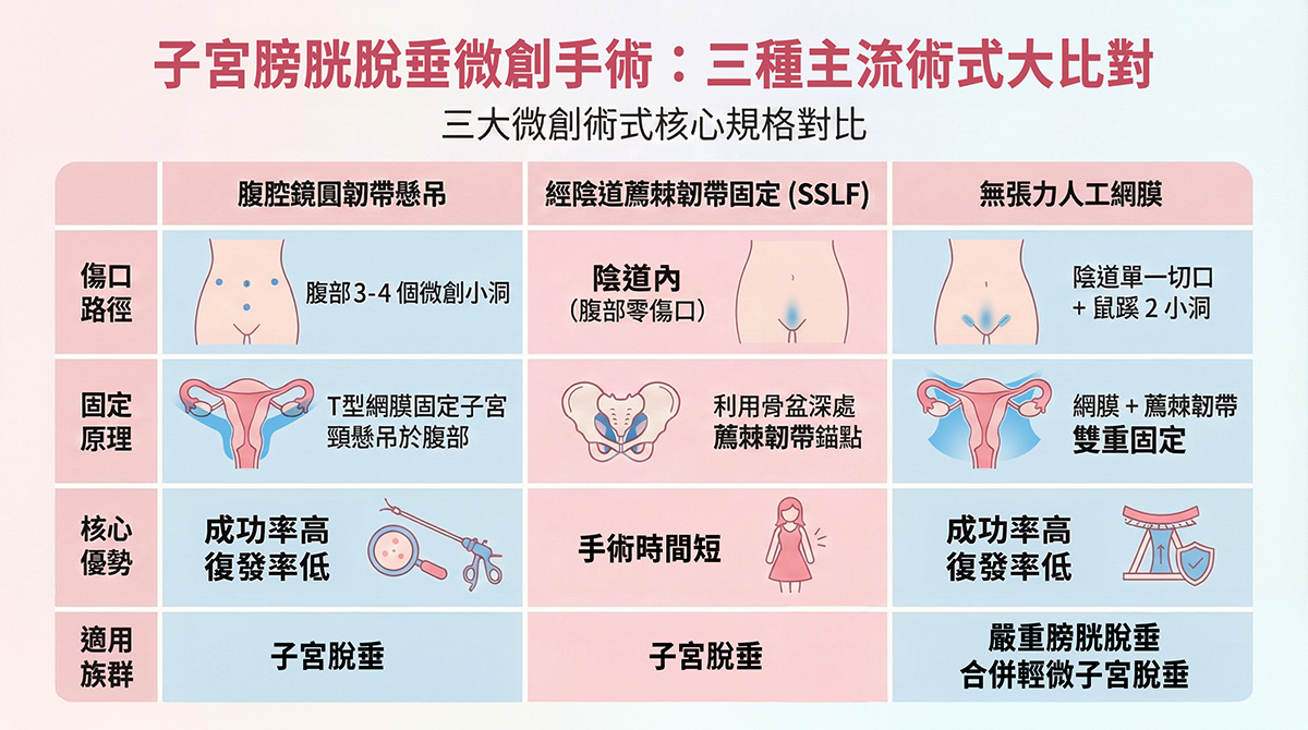 手術全程經由陰道進行,腹部完全無傷口。主要利用骨盆深處強韌的「薦棘韌帶」作為錨點,將子宮或陰道頂端重新懸吊歸位。