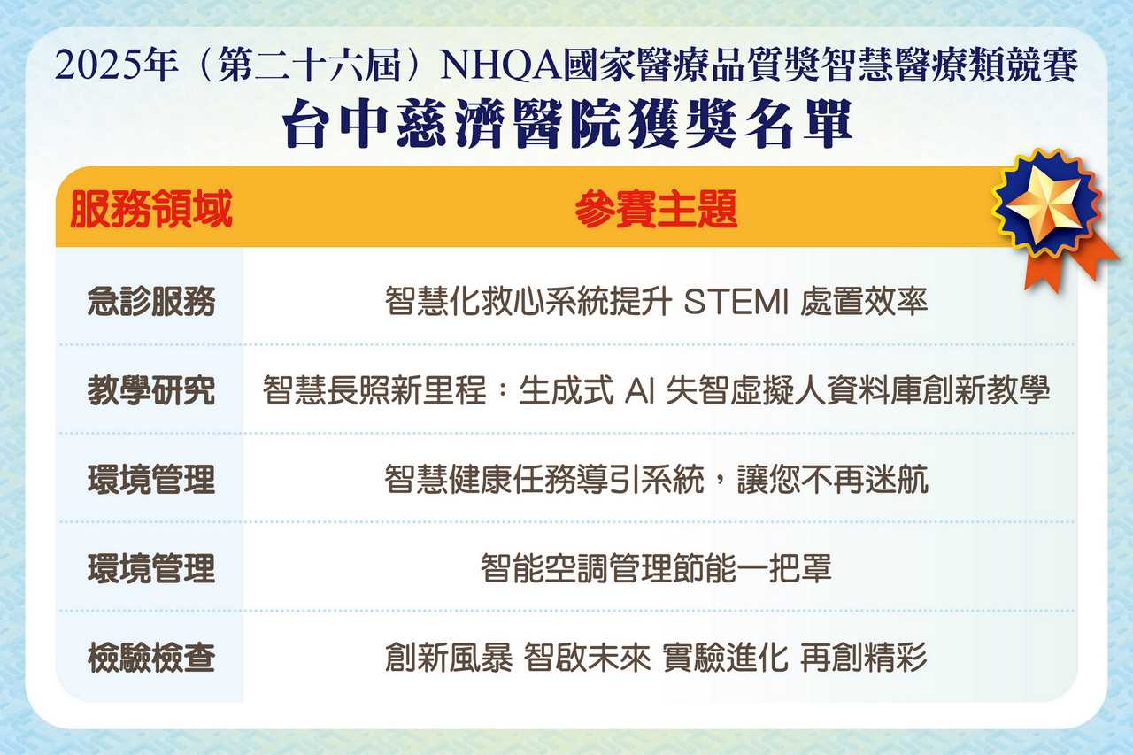 台中慈濟醫院在第26屆NHQA國家醫療品質獎智慧醫療類競賽,再創佳績,一舉榮獲五項智慧醫療標章,展現從臨床到教學、從管理到永續的全面革新成果。台中慈濟醫院副院長暨AI中心主任莊淑婷表示,未來仍將持續不斷精進,朝向「智慧醫院」的目標邁進。
