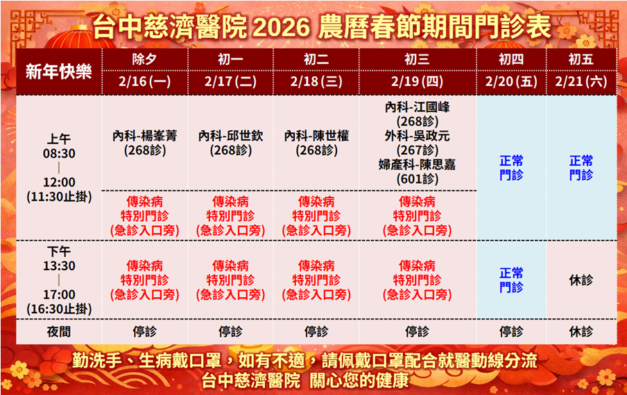 各位大德 日安,本院2026年農曆春節期間門診及看診地點如下: