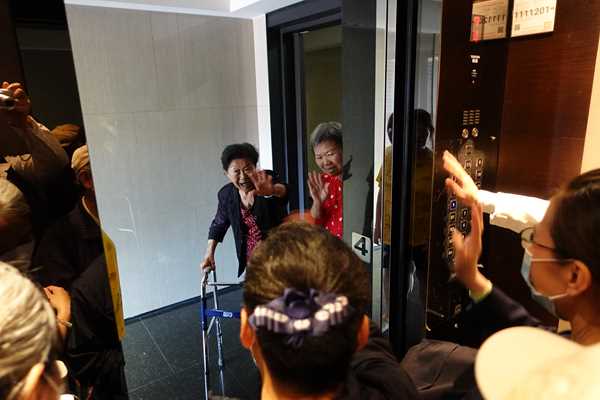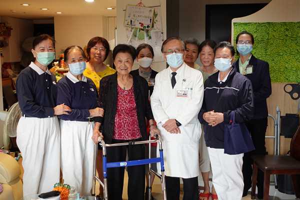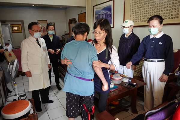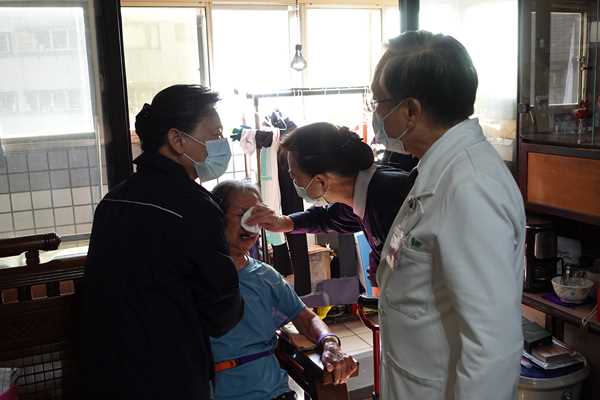團隊轉往另一位是88歲法親魏淑珍師姊家,彷彿換成不同的場景。淑珍師姊盛裝打扮歡迎簡院長,原本笑臉迎人,卻忽然又哭著敘述過去的辛苦,情緒起伏話語不斷。負責照顧的二女兒連忙安撫:「媽媽,你這樣院長會聽不懂啦!」二女兒解釋由於媽媽失智與重聽,會因為記憶中斷而情緒轉變,必須不斷大聲提醒。身為照顧者久而久之也熟悉媽媽情緒模式,能及時幫簡院長解釋魏師姊的對話脈絡。二女兒將母親照顧得很好,簡院長與社區組隊愉快的和魏師姊互動,大家拍了合照作為紀念。離開時,淑珍師姊甚至拄著拐杖到電梯口歡送。「家人最辛苦了!」簡院長簡單的六個字道盡照顧者的心力付出。