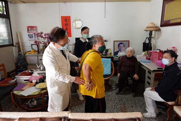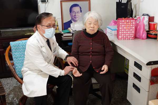 車行沿著麻園頭溪轉入住宅區,團隊探視的是委員號J2353已78歲的王陳秋月師姊。秋月師姊罹患巴金森與肌張力不全,攣縮症狀造成行動與講話能力逐漸下降,加上疫情無法回診,病情有惡化趨勢。他的大女兒在陽臺搭了床板就近照護,他一邊示範如何抱起媽媽走路復健,一邊和簡院長說明母親的病況。