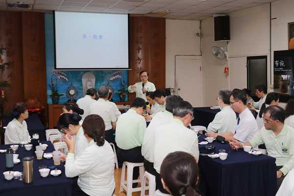 院部主管抵達後,團隊大合照,簡院長笑稱這是絕無僅有在環保站開院務會議的第一次,他勉勵同仁,走出醫院走進環保站,出來動一動是提醒同仁照顧自己的健康跟身材,更要學習環保志工疼惜地球;醫院品質要好就要看見並學習環保志工分類的專業。他期許主管能帶動近兩千位同仁,在家與在醫院做好分類,讓年輕的家人也能投入環保,讓環保志工年輕化。會議場地佈置得典雅,師兄姊備好精緻茶點,融入的慈濟人文讓同仁甜了心暖了胃,留下一次特別經驗。