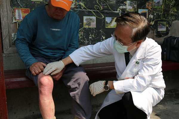 天寬地闊的公老坪人車稀少,公車候車亭暫時成了最佳的診間,簡院長關心詢問涂先生身體狀況,他回答身體很癢,翻開衣服,手、腳、胸部、背部都是一大片一大片紅紅的,簡院長一看便知是乾癬症,問「有看醫生吃藥嗎」?「曾經有一個醫生有來看過,有給一小條的藥膏,但是擦一隻腳就用完了」,簡院長拿了六條藥膏交給他,並請涂先生放心,「如果擦了有效,藥膏用完,我們會再送來給你」。 長期關懷的志工跟院長說:「之後會來關懷他用藥的效果,再跟院長報告」。