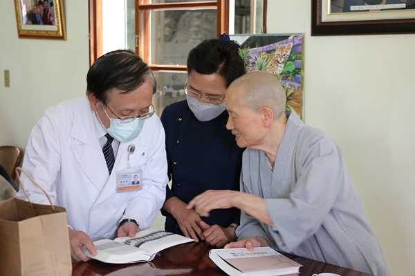 此行另一個目的就是要協助照顧慈雲寺法師們的健康。院長一一詢問每位法師「身體有哪些不舒服?」年長的法師,有的灰指甲、有的肩膀痠疼、有的腳行動不便,院長分別依症狀給予藥膏或請人文組協助掛號,日後再請志工陪伴到慈濟醫院看診,貼心的服務,讓法師們非常感恩與感動。