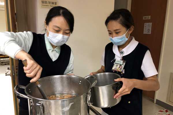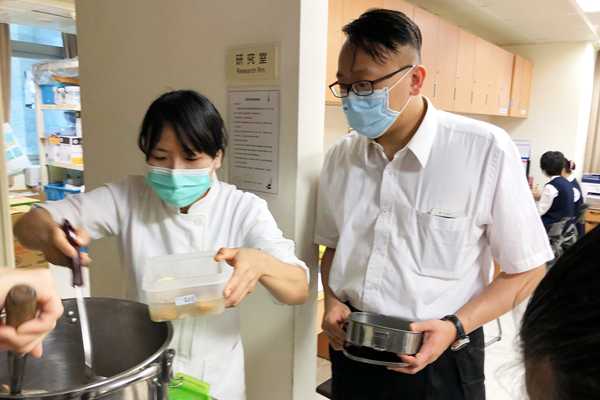 十九日的油飯、四神湯是北屯一及北屯四師兄師姊早上開始手做,特地準備密封湯桶保溫又防灑。9A病房副護理長何亞蓁表示,平常志工師兄姊會幫忙庶務,關懷慰問住院獨居或住院醫院較久的病人,甚至替病人採買物品,師兄姊暫停來院,不只單位同仁,連病人也都想念師兄姊的陪伴。正巡房的神經內科醫師林琪偉聞香而來,看見小餐點,直說想念懿德爸媽,期望疫情快結束,爸媽們平安健康。