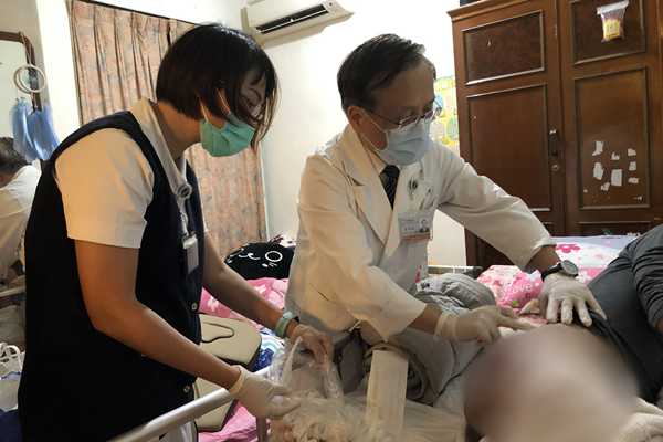 文哥的床位於一樓客廳旁房間,旁邊的雙人床就是照顧者床位,看得出來,父母對孩子時時刻刻的呵護。室內光線不佳,張華茹護理師用手機的手電筒照射下,大片褥瘡傷口一目了然,對不熟悉醫療的人而言,乍看之下頗為怵目驚心,但實際上已有逐漸好轉跡象。經驗豐富的簡院長,細心的在皮瓣逢線處,擠出膿液並親自動手清洗傷口,文哥身體舒適許多。