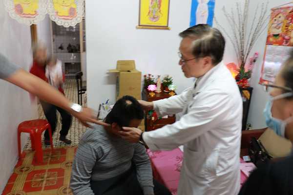 一進門,迎來滿臉笑容的國中男生,簡院長立刻發覺他頭頂上明顯掉髮,檢視後,簡院長表示:「問題不大!只是毛囊發炎引起掉髮,只要擦藥控制發炎,頭髮就會漸漸再長回來」。陪同的志工們放心許多,剛巧媽媽採購回家,簡院長轉而關心他腿部復原狀況,並把藥膏交給母親。這趟往診醫療需求不大,多了一分簡院長的細心與關懷,全方位照顧母子身心健康,彰顯往診的意義。