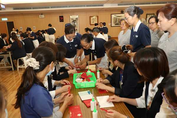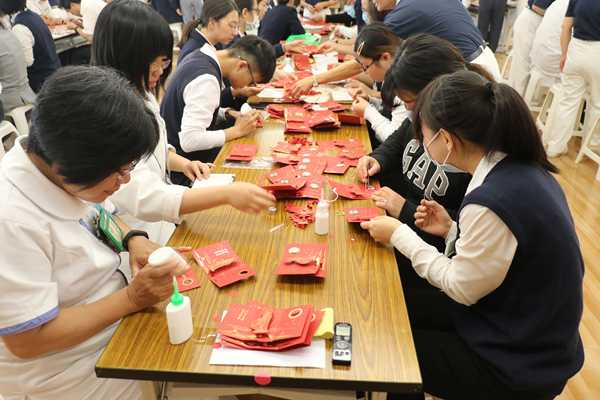 七日上午七點三十分左右,第四聯區師兄姊已備好製作福慧紅包的材料與工具,等待同仁一起來製作福慧紅包。開始動手前,靜淇師姊特別為大家簡短解說福慧紅包的由來與意涵。簡守信院長也以「世界愈快,則心愈慢」的廣告詞勉勵同仁在紛亂的世界中,找到把心安定下來的「錨」。