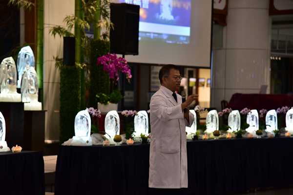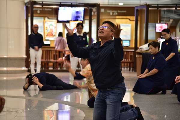 第四聯區團隊師兄姊協力安排,臺中慈院廿日晚間七月吉祥孝親祈福會隆重登場,廿五座宇宙大覺者透出光亮,大廳瞬時成為道場,引領同仁與會眾心靈方向。典禮正式開始前,靜淇師姊輔導神經內科醫師傅進華承擔主持人,引導獻供人員走位綵排。正式開場,穩穩帶領大眾進入祈福會,維持程序儀式流暢又呈現虔誠莊嚴。