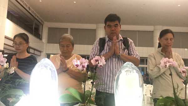 馬來西亞孫金海先生(右二)與母親(左二)祈福。(馬順德攝)