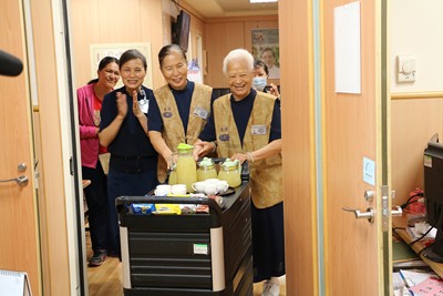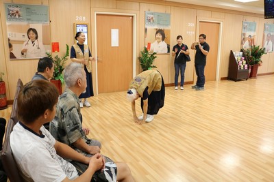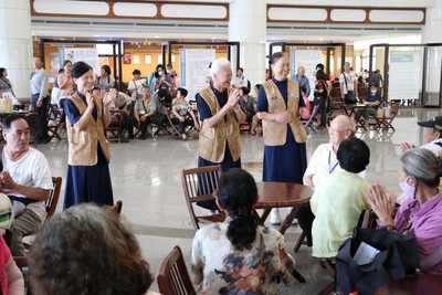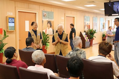 八月中旬日常的臺中慈院,醫師、護理師、行政同仁各安其位、各司其職,但志工群湧動一股喜悅的氣氛。這梯醫療志工來自彰化,其中一位白髮志工到各定點總吸引人群好奇,圍觀他展示柔軟筋骨,演示站姿體前彎。領隊黃水月師姊陪伴在旁,喜氣地吆喝著「百歲志工來祝福大家喔~」