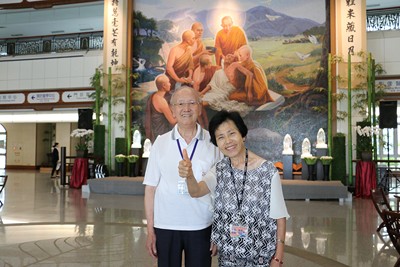 下圖:來自中興新村的向良武、楊旭輝夫妻直比大拇指,說蔡寬師姊真不簡單。(謝明錦攝)