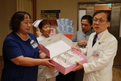 來自醫院、醫師以及護理師公會等單位大大小小禮物,匯集成溫馨專車,簡院長一一介紹來自各方祝福的禮物,並與護理師幸福合影。小兒科李敏駿主任在六B病房介紹禮物時,唸著公會致贈精緻杯組上的英文「I am happy because I enjoy my life」,翻譯成靜思語「甘願做、歡喜受」,巧思讓大家驚嘆不已。六B病房護理同仁陳美鳳感恩來自各方的禮品,是工作忙碌之餘的「小確幸」。張梅芳主任則說,跟之前醫院比較,臺中慈院的禮物真的多很多,除了公會、護理部之外,還有福委會以及懿德爸媽滿滿的心意,每位護理師也都會收到醫師送的禮券,這份心意讓同仁備感幸福。
