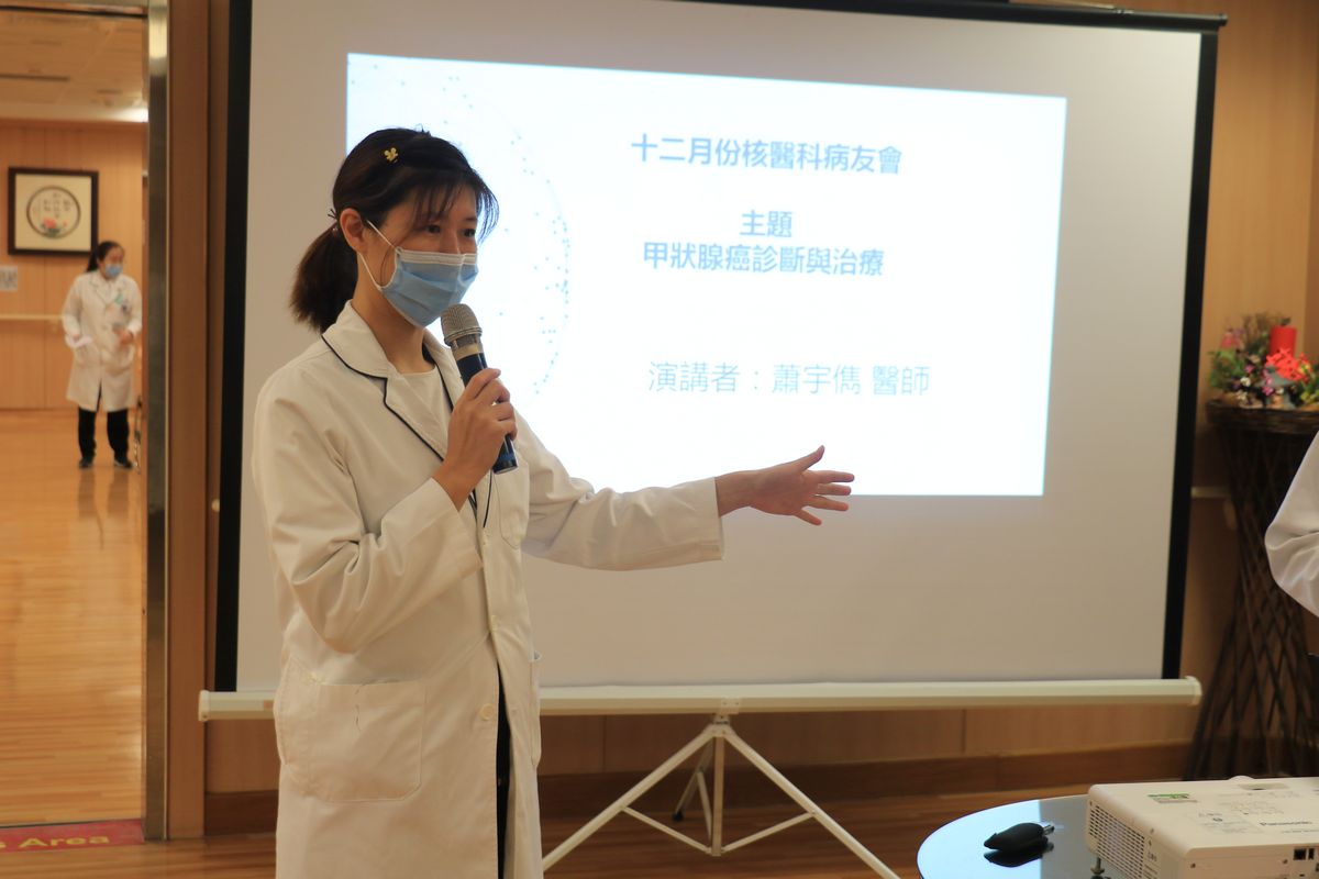 台中慈濟醫院核子醫學科12月18日舉辦病友會,由蕭宇儁醫師介紹甲狀腺癌與治療流程,強調提早發現就有機會進行更好的治療,並詳細說明碘131治療的原理與禁忌。陳慶元主任在台中慈院推動病友會十餘年,建立醫病「扣環」般的情誼與信任,陪伴甲狀腺癌友展開抗癌新人生。