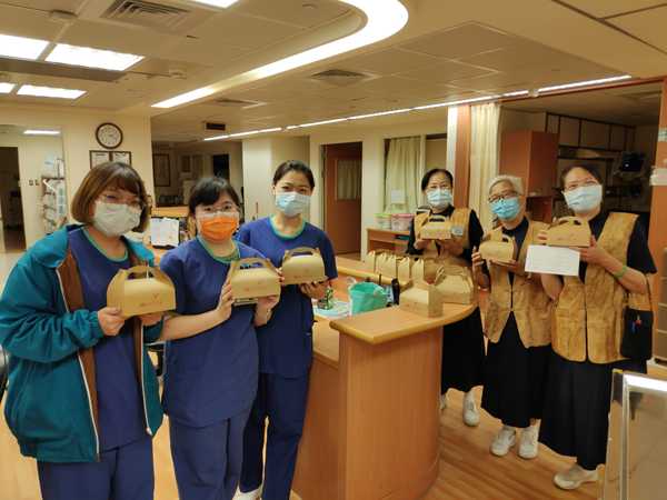 醫療志工分送壽桃也有兩條路線,病房區這一線的志工從11樓往6樓逐層分送,下午一時半,正是病房護理人員十分忙碌的時間,各病房由護理長代表收下祝福,稍有空檔的單位則一同接收來自精舍的祝福。